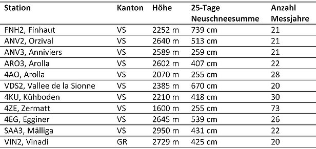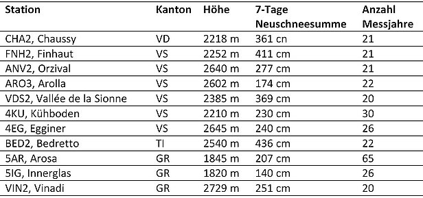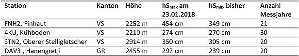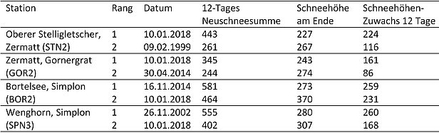 Rund ein Drittel aller langjährigen Beobachterstationen unterhalb von 2000 m hatte an einem 23. Januar noch nie so viel Schnee gemessen wie 2018. Absolute Rekordschneehöhen an Stationen mit mindestens 20-jähriger Messreihe wurden aber nur an drei Stationen im Wallis und einer Station in Graubünden erreicht (Tabelle 12). Eine Analyse bezogen auf den ganzen Winter zeigt, dass maximale Schneehöhen wie sie 2018 erreicht wurden, in den besonders betroffenen Gebieten des Wallis und Graubündens trotzdem nur alle 15 bis 30 Jahre erwartet werden können.