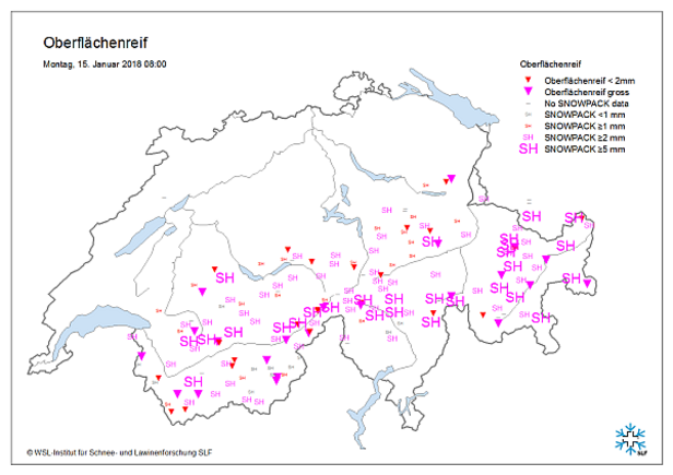 Einige schöne Tage mit klaren Nächten (10. bis 15. Januar 2018) hatten aber dazu geführt, dass die oberflächennahen Schichten an Schattenhängen kantig aufgebaut und locker waren. Zudem lag an der Oberfläche verbreitet teils grosser Oberflächenreif (Abbildung 93). Die Altschneeoberfläche stellte damit eine potenzielle Schwachschicht für die folgenden Schneefälle dar.