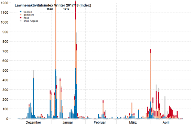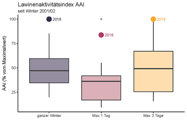 2017/18 war der lawinenreichste Winter seit Beginn der Berechnungen des Lawinenaktivitätsindexes im Winter 2001/02 und damit wohl seit dem Lawinenwinter 1998/99 (Abbildung 113). Vom 21. bis 23. Januar war die grösste 3-tägige Lawinenperiode seit der Lawinenaktivitätsindex berechnet wird, und damit wohl ebenfalls seit Februar 1999.