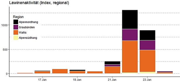 Besonders am 22. und 23. Januar 2018 gingen sehr viele Lawinen ab, darunter auch viele grosse und mehrfach sehr grosse (Grössen 4 und 5). Dies führte an beiden Tagen zu einem hohen Lawinenaktivitätsindex. Während der ganzen Periode war die Lawinenaktivität im Wallis am grössten, gefolgt vom Alpennordhang und von Graubünden (Abbildung 114).
