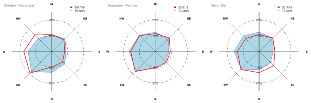 Im Herbst 2017 waren West- und Nordwestlagen, im Frühling 2018 dann Südostanströmungen etwas häufiger als normal (Abbildung 2). Sonst waren die Strömungslagen gleich verteilt wie im langjährigen Mittel.