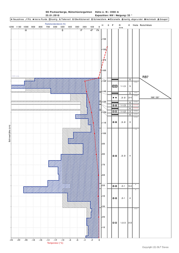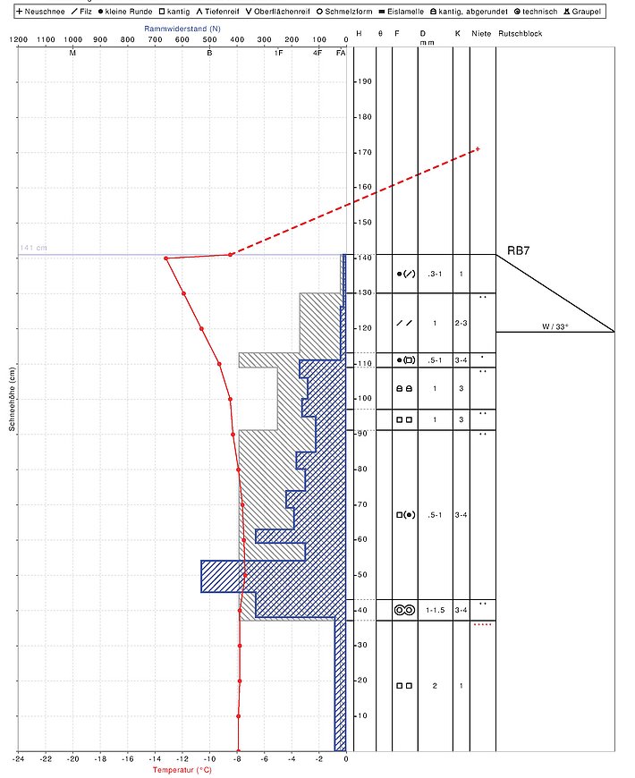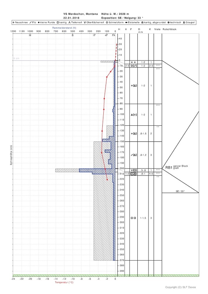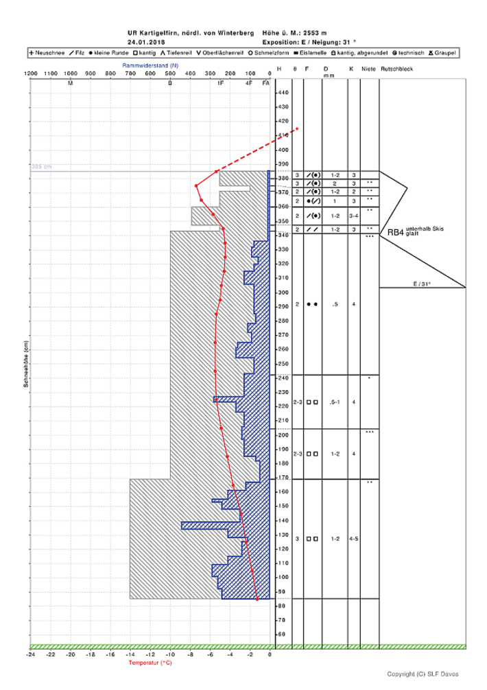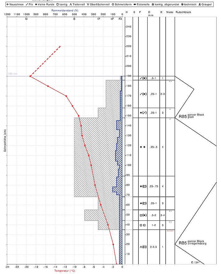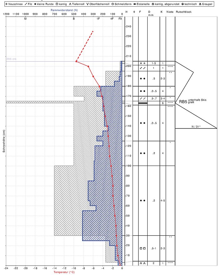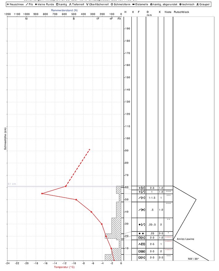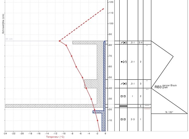 Schneedeckenuntersuchungen während dieser Tage liegen kaum vor. In den später durchgeführten Untersuchungen wurden innerhalb der riesigen Neu- und Triebschneeschichten keine ausgeprägten Schwachschichten mehr gefunden (Abbildung 96 und 97). Damit dürften viele Lawinen in kurzlebigen Schwachschichten innerhalb der verschiedenen Neu- und Triebschneeschichten angebrochen sein. Das erklärt auch die teils hohe Lawinenaktivität an Südosthängen. Diverse Aufnahmen von Lawinen deuten darauf hin, dass die Lawinen in ihrer Sturzbahn teils grosse Teile der noch frischen Schneedecke mitrissen (bedeutendes Entrainment).
