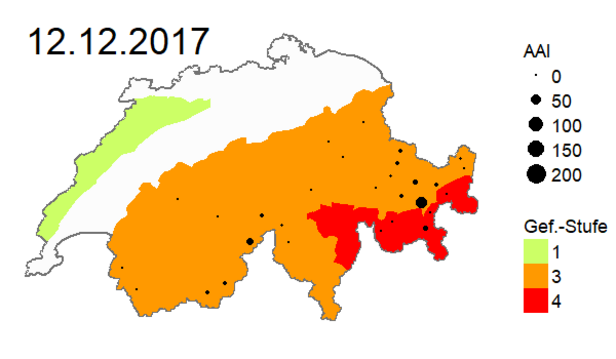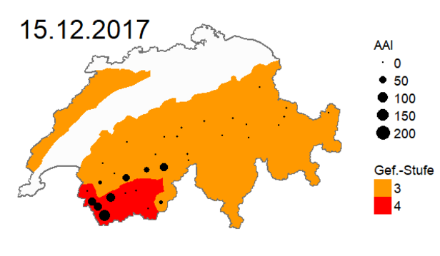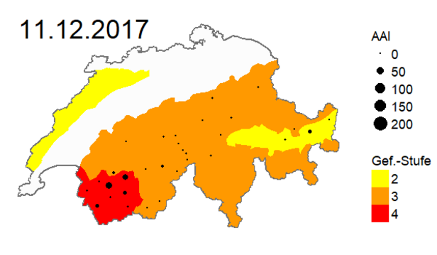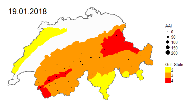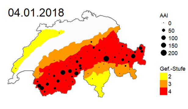 Die Lawinenaktivität wurde anhand des Lawinenaktivitätsindexes AAI bestimmt. Zur Berechnung dieses dimensionslosen Indexes werden die von den SLF-Beobachtern gemeldeten Lawinen nach Anzahl, Grösse und Auslöseart gewichtet und dann addiert.