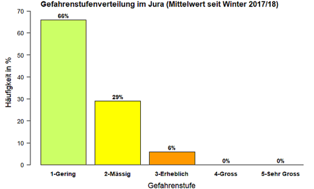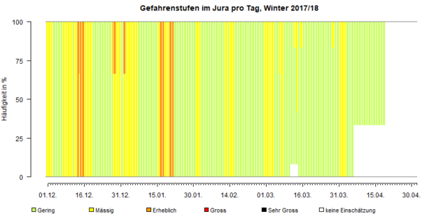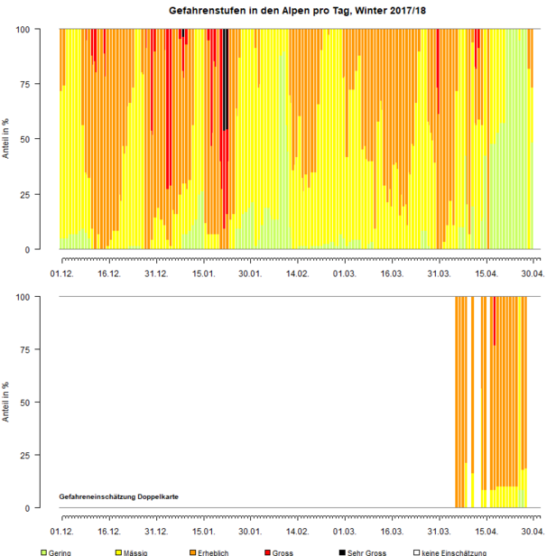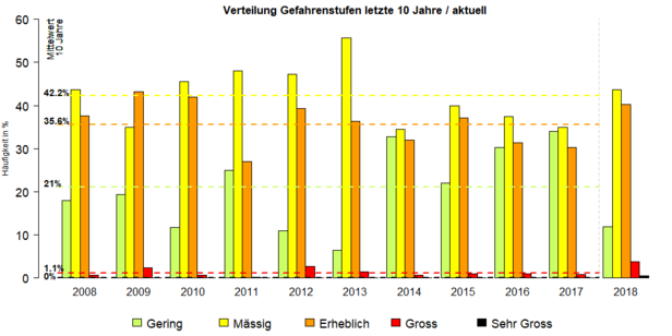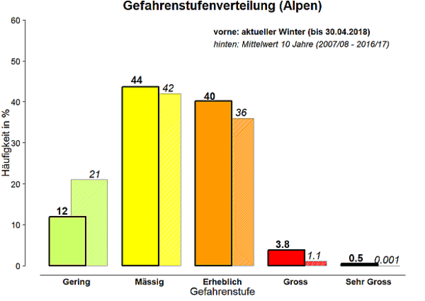 Im Winter 2017/18 wurden die hohen Gefahrenstufen (4 und 5) häufiger prognostiziert als im langjährigen Mittel. Die Stufe 4 (gross) wurde mit 3.4 % dreimal so oft verwendet wie im Mittel der letzten 10 Jahre (1.1 %). Die Stufe 5 (sehr gross) wurde grossflächig an 1.5 Tagen heraus gegeben. Sie war seit 2008 nicht mehr verwendet worden, und auch damals nur für ein kleines Gebiet. Zum letzten Mal grossflächig prognostiziert wurde die Stufe 5 im Lawinenwinter 1999, damals aber über eine längere Zeitspanne. Günstige Situationen mit Gefahrenstufe 1 (gering) dagegen waren mit 17 % etwas seltener als im langjährigen Mittel (21 %).
