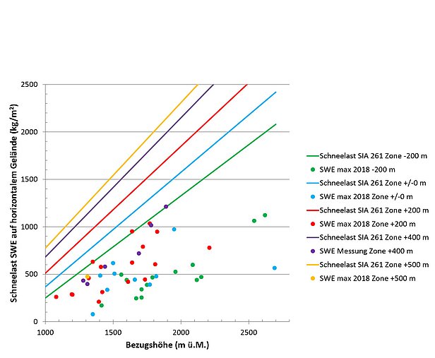 An vier Vergleichsstationen mit Messreihen von mindestens 30 Jahren wurden im Winter 2017/18 neue Maximalwerte der Schneelast gemessen. Beispielsweise auf der Rigi (1640 m, 57 Jahre) wurde eine neue Rekordschneelast von 950 kg/m2 gemessen. Ein Vergleich der im Winter 2017/18 gemessenen Schneelasten mit der Schneelast gemäss der Norm SIA 261 zeigt erwartungsgemäss, dass an keiner Messstelle die SIA-Schneelast erreicht wurde (Abbildung 91). Folglich sind uns nur wenige Gebäudeschäden infolge zu grosser Dachschneelast bekannt. Im Lawinenwinter 1999 lag insbesondere in tieferen Lagen bedeutend mehr Schnee als im Winter 2017/18 und die Schneelasten waren mehrheitlich grösser. Im Winter 1999 betrugen die Schneelastschäden an Gebäuden gegen 100 Millionen Franken.
