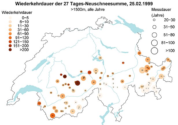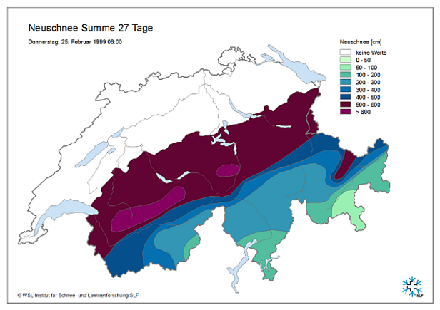 Für den Lawinenwinter 1999 relevant war die 30- Tages-Neuschneesumme über alle drei Niederschlagsperioden. Am höchsten war diese am Alpennordhang mit 5.5 bis 7.5 m, was einer Jährlichkeit von gegen 80 bis 100 Jahren entspricht (SLF, 2000).