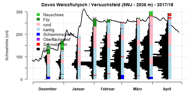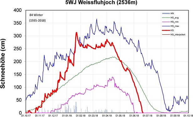 Die Schneehöhenentwicklung in den hohen Lagen Nord- und Mittelbündens sowie des Unterengadins kann anhand der langjährigen Vergleichsstation Weissfluhjoch, 2540m (Abbildung 19) verfolgt werden.