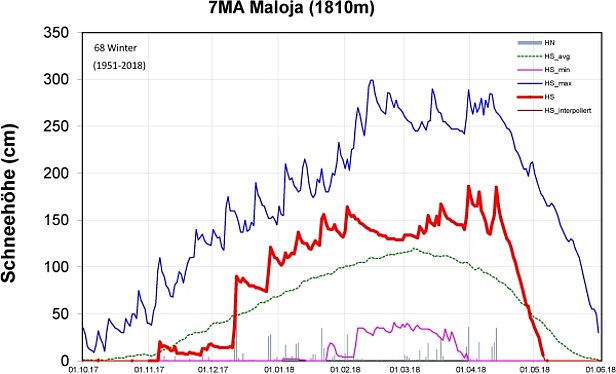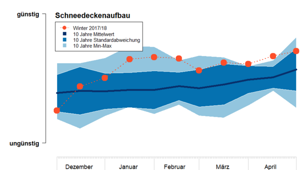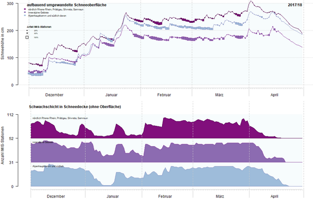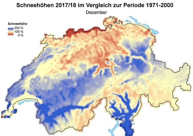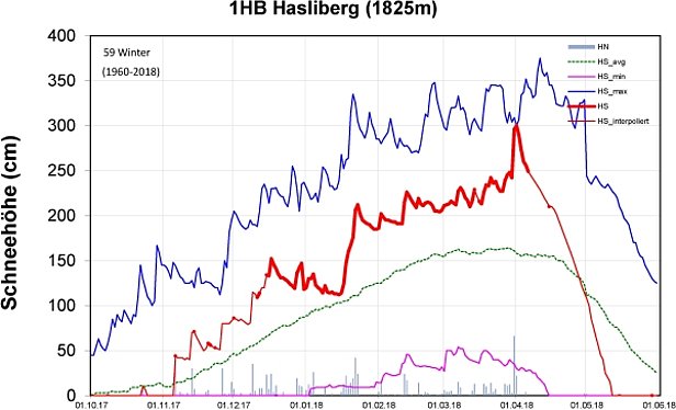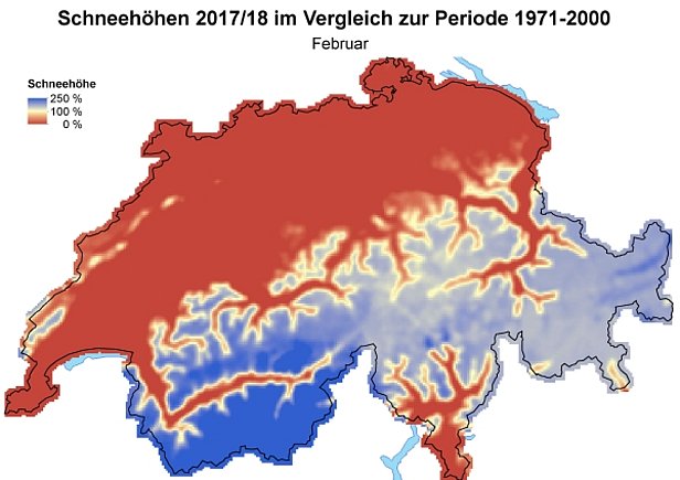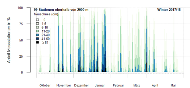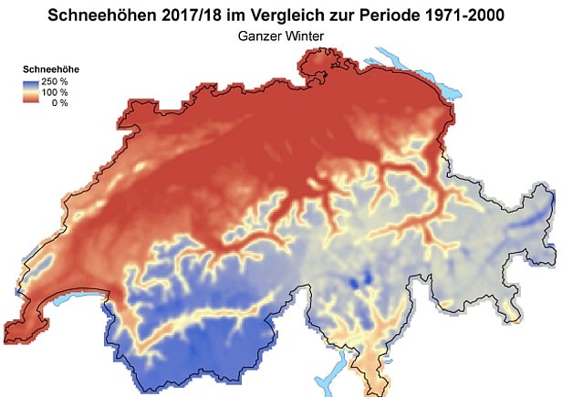 Nach drei mageren Jahren war 2017/18 zumindest in den Bergen ein «richtiger» Winter. Nach einem frühen Winterstart war vor allem der Januar sehr niederschlagsreich, aber auch rekordmässig warm. Während es in tiefen Lagen oft regnete, fielen in hohen Lagen enorme Schneemengen. In der Höhe erreichten die Schneehöhen in der zweiten Januarhälfte an vielen Orten der Schweizer Alpen neue Rekordwerte für das jeweilige Datum. Bis Ende März blieben die Schneemengen in der Höhe stark überdurchschnittlich, danach nahmen sie im sehr warmen und trockenen April rasch ab. Über den ganzen Winter betrachtet, lag oberhalb von 1500 m etwa gleich viel Schnee wie 2008/09. Mehr war es letztmals im Winter 1981/82. Unterhalb von 1000 m lag hingegen nur knapp halb so viel Schnee wie üblich. Im Lawinenwinter 1998/99 wurden sehr grosse, maximale Schneehöhen erreicht. Wegen des schneearmen Winteranfangs blieben die über den ganzen Winter gemittelten Schneehöhen aber unter denen des aktuellen Winters.