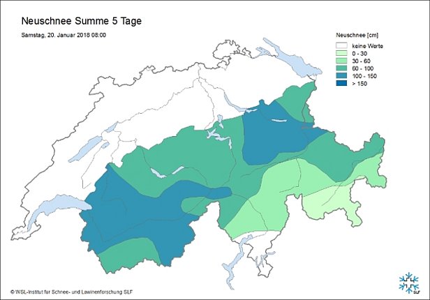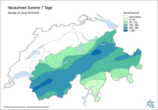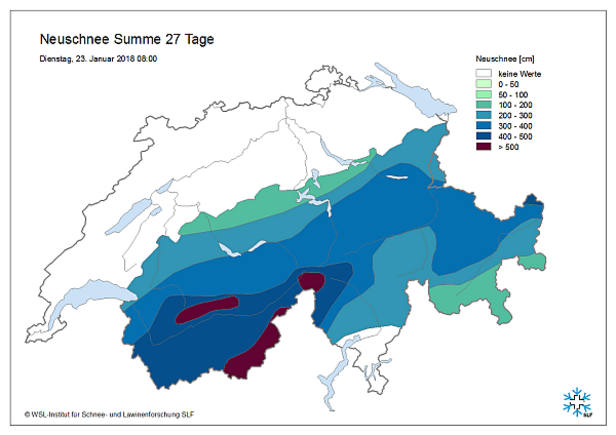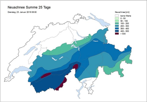 Insgesamt waren bis am 23. Januar in hohen Lagen innerhalb von 25 Tagen verbreitet 2.5 bis 5 m Schnee gefallen, wobei die grössten Mengen im sonst eher trockenen Wallis registriert wurden. An gewissen Stationen ist das so viel, wie nur alle 75 Jahre zu erwarten ist.