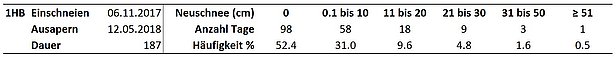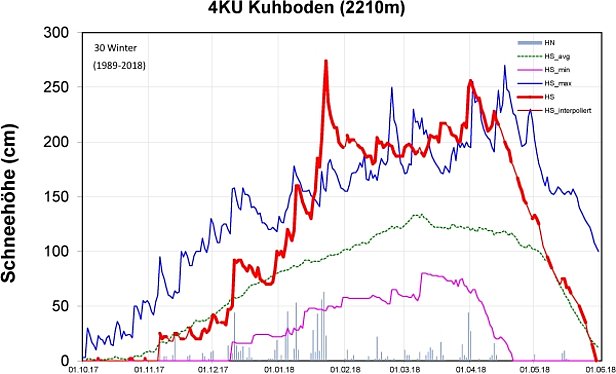 Eine durchgehende Winterschneedecke lag an der Station Kühboden während 205 Tagen. In dieser Zeit wurde an 95 Tagen Neuschnee gemessen, dabei 3-mal mehr als 50 cm (Tabelle 2). Der maximale Wasserwert wurde Mitte April mit 779 mm gemessen. Dieser Wert liegt um mehr als die Hälfte über dem Maximum eines durchschnittlichen Winters, und nur noch 21 mm unter dem Allzeit-Maximum der 29-jährigen Messreihe.