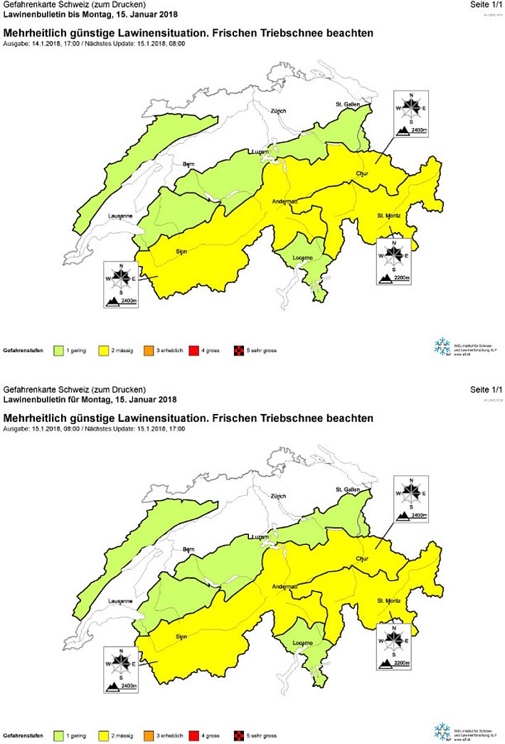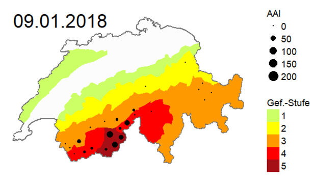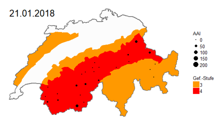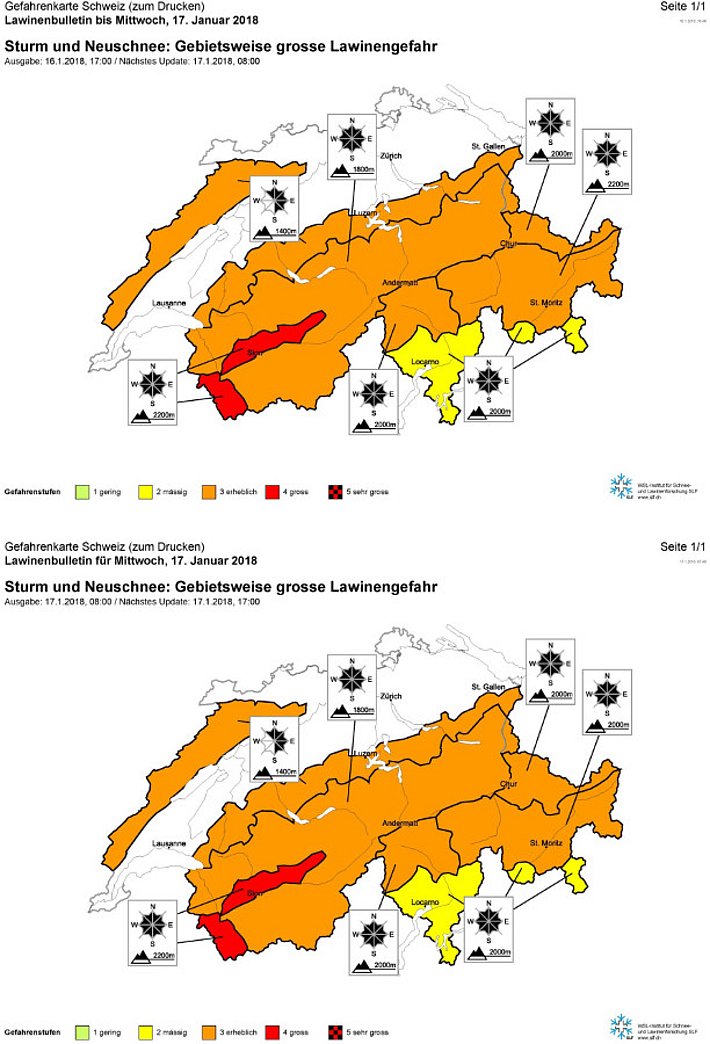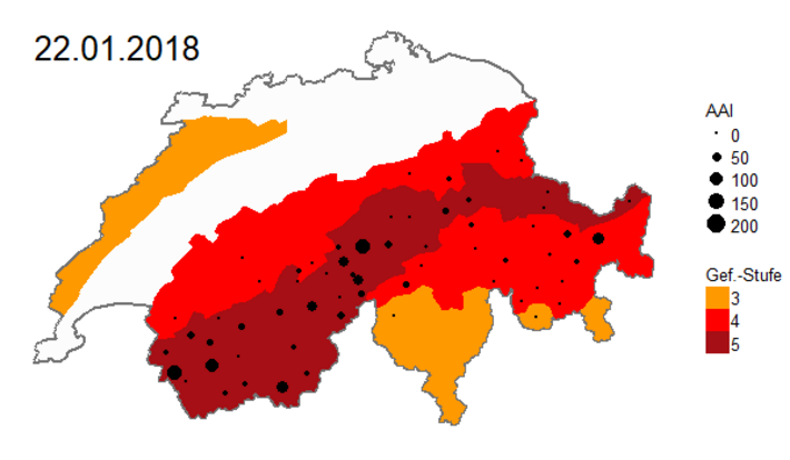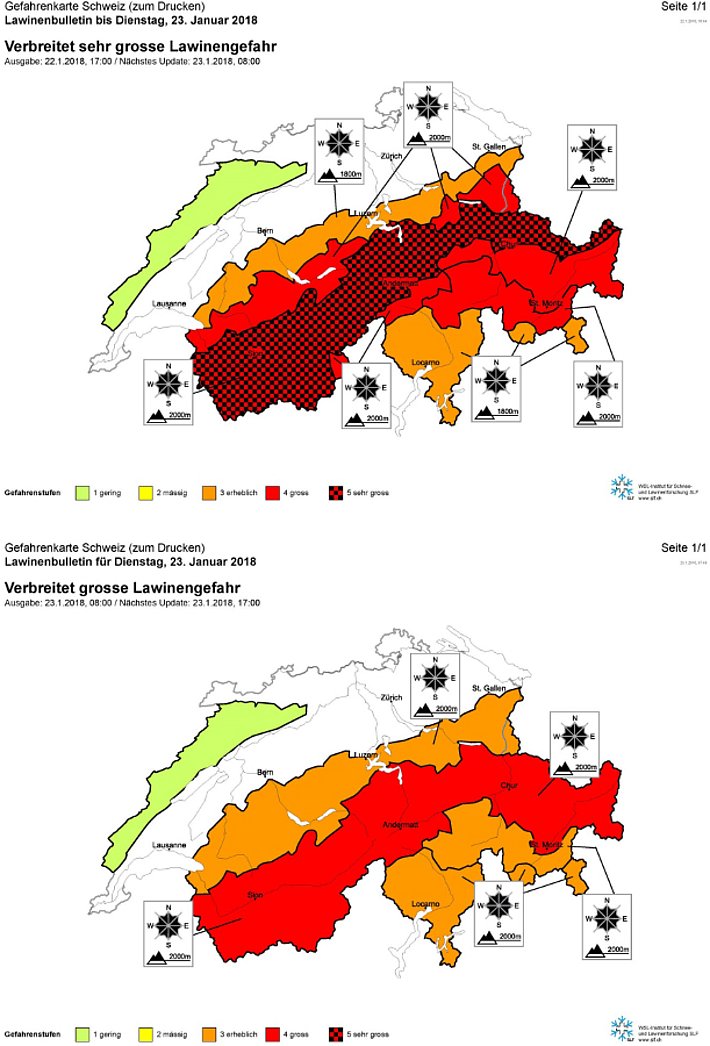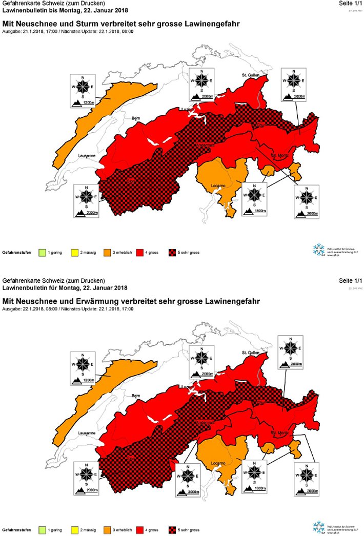 Von Sonntagabend, 21. Januar bis Dienstagmorgen, 23. Januar wurde praktisch für das gesamte Wallis, Teile des nördlichen Alpenkammes sowie vom Prättigau bis ins Samnaun die Gefahrenstufe 5 (sehr gross) prognostiziert (Abbildungen 109 bis 112).