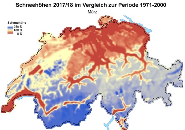 Ende März lagen auf 2000m in den ganzen Schweizer Alpen ausser dem mittleren und südlichen Tessin sowie Teilen des Engadins 2 bis 4 m Schnee. Damit waren die Schneehöhen vielerorts 1.5- bis 2-mal so hoch wie üblich. Auch über den ganzen März betrachtet waren die Schneehöhen in der Höhe über-, in tiefen Lagen dagegen verbreitet unterdurchschnittlich (Abbildung 9/5).