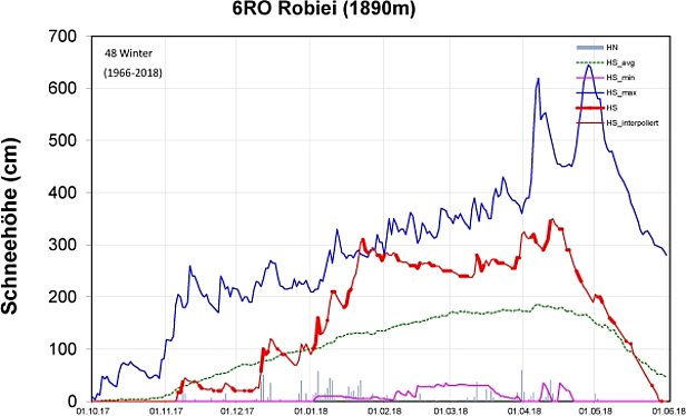 Im Süden war der Vorwinter schneearm, bevor Mitte Dezember durchschnittliche Werte erreicht wurden. Die Schneefälle im Januar waren vor allem im nordwestlichen Tessin ergiebig. Dort wurden teils maximale Schneehöhen für gewisse Kalendertage registriert, so auch in Robiei vom 22. bis 25. und am 27./28. Januar. Diese Schneehöhen lagen aber weit unter den maximalen, je gemessenen Schneehöhen, in Robiei z.B. bei nur wenig mehr als der Hälfte. Danach blieben die Schneehöhen bis Mitte April im nordwestlichen Tessin für lange Zeit überdurchschnittlich, in den anderen Gebieten im Durchschnitt oder leicht darüber. Ab Mitte April setze auch im Süden eine intensive Schneeschmelze ein. Am 28. Mai war die Station früher als üblich ausgeapert.