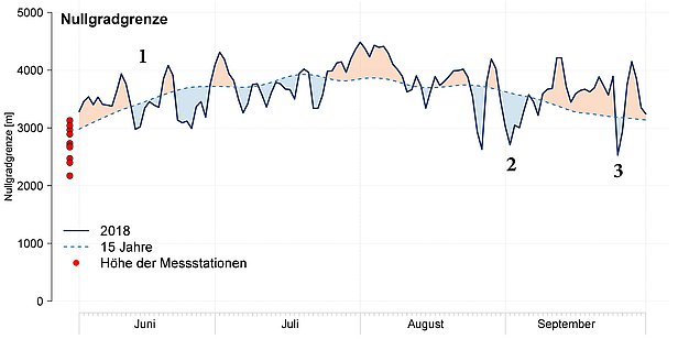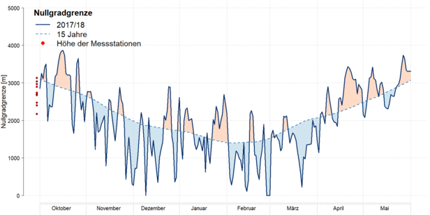 Im Winter 2017/18 wichen die Durchschnittstemperaturen der einzelnen Monate teils stark vom langjährigen Mittel ab, und das sowohl nach unten als auch nach oben. Auf den sehr sonnigen und überdurchschnittlich warmen Oktober folgten zwei in den Bergen etwas zu kalte Monate. Der Januar war der wärmste seit Beginn der Messungen von MeteoSchweiz im Jahre 1864, der April der zweitwärmste. Dazwischen lagen zwei zu kalte Monate. Der Februar, und im Süden auch der März, gehörten zu den kältesten der letzten 30 Jahre. Insgesamt war der Hochwinter (Dezember bis Februar) gemäss MeteoSchweiz in den Bergen geringfügig kühler und im Flachland geringfügig wärmer als im Durchschnitt der Vergleichsperiode 1981 bis 2010. Abbildung 3 zeigt den Verlauf der Nullgradgrenze im Winter 2017/18 im Vergleich zum Durchschnitt der 15 Vorjahre.