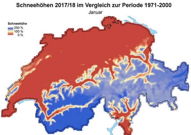 Der Januar war aussergewöhnlich niederschlagsreich und gleichzeitig der wärmste seit Messbeginn. Dies führte einerseits zum Wegschmelzen des Schnees in tiefen Lagen und andererseits zu extremen Schneemengen in den mittleren und hohen Lagen. Die langjährigen Stationen Saas-Fee und Zermatt registrierten dabei die höchsten Januar-Neuschneesummen seit Messbeginn vor mehr als 70 Jahren. Insgesamt wurden während der 25-tägigen Niederschlagsperiode vom 30. Dezember bis 23. Januar in Teilen des Wallis und Tessins oberhalb 2000 m bis zu 5 m Neuschnee gemessen. Im Vergleich mit der 30-tägigen Neuschneesumme im Januar/Februar 1999 sind das 60 bis 80 % der damals am Alpennordhang gemessenen Neuschneesummen. In der zweiten Januarhälfte erreichte die Schneehöhe an viele Orten in den ganzen Schweizer Alpen neue Rekordwerte für das jeweilige Datum.