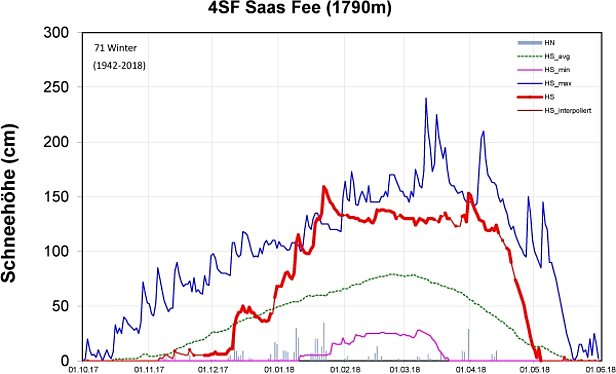 Wie im ganzen Wallis war der Winter 2017/18 auch in den Vispertälern aussergewöhnlich schneereich. Sie werden hier separat behandelt, weil hier zusätzlich zwei Südostanströmungen am 8./9. Januar und Anfangs Mai grosse Niederschläge brachten. Die Schneehöhenentwicklung wird anhand der langjährigen Vergleichsstation Saas Fee (Abbildung 13) verfolgt. Weil auf dieser Höhe der Niederschlag teils als Regen fiel, wird zusätzlich die höher gelegene, automatische IMIS-Schneestation Gornergratsee abgebildet (Abbildung 14). Diese weist allerdings eine Messreihe von erst 26 Jahren auf.