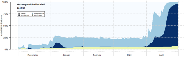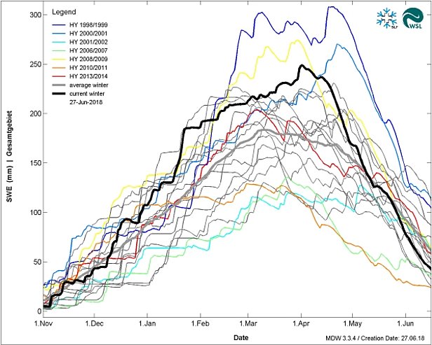 Ab Mitte April setzte eine intensive Schmelze ein, so dass die Station Saas Fee bereits am 4. Mai ausaperte. In der Höhe dagegen fiel Anfang Mai nochmals Schnee und die Schneehöhen waren auch Ende Juni noch klar überdurchschnittlich.