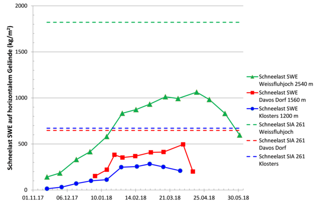 Im Winter 2017/18 wurde an 48 Vergleichsstationen alle 14 Tage die Schneelast resp. der Wasserwert der Gesamtschneedecke (SWE) bestimmt. Am 23. Januar 2018 betrug in Davos die Schneelast 380 kg/m2. Dieser Wert entspricht rund 60% der SIA Schneelast von 640 kg/m2. Da davon auszugehen war, dass im weiteren Verlauf des Winters die Schneelast weiter ansteigen könnte, wurde beispielsweise Schnee vom Dach der Eishalle in Davos geräumt (Abbildung 89). Die maximale Schneelast des Winters betrug in Davos am 3. April 2018 500 kg/m2 was 78% der SIA-Schneelast entspricht (Abbildung 90).
