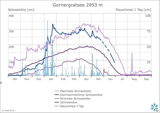 - Oberhalb von rund 2100 m waren die Schneehöhen überall überdurchschnittlich. Im Westen und im Wallis lagen die Werte klar über dem Durchschnitt, im südlichen Wallis teils stark darüber.