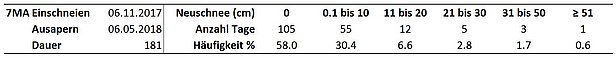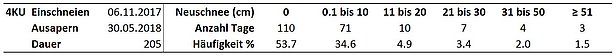 Eine durchgehende Winterschneedecke lag während 242 Tagen. In dieser Zeit wurden an mehr als der Hälfte der Tage (127) Neuschnee gemessen, dabei 6 Mal über 30 cm (Tabelle 4). Der maximale Wasserwert lag mit 1063 mm über dem Durchschnitt der 82-jährigen Wasserwert-Messreihe von 847 mm, aber weit unter dem absoluten Maximum von 1447 mm des Winters 1944/45.