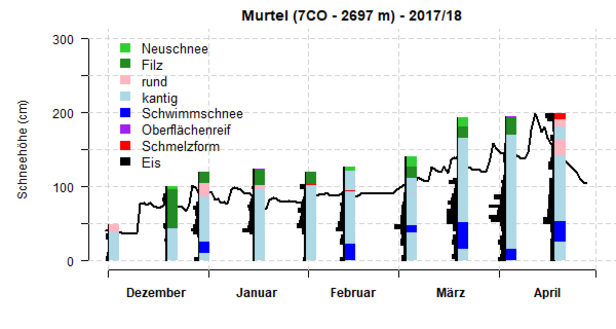Beim Einschneien am 6. November stieg die Schneehöhe sogleich auf überdurchschnittliche Werte. Wiederholte Schneefälle liessen die Schneedecke ansteigen bis zu einer Spitze am 17. Dezember. Dieser Wert wurde erst am 19. Januar übertroffen, nicht zuletzt weil ein grosser Teil des Niederschlags vom 1. bis 4. Januar als Regen fiel. Auch am 22. Januar fiel zeitweise Regen, sodass die Schneehöhe trotz intensiver Niederschläge nur noch wenig anstieg. Die bereits mehrfach verregnete Schneedecke setzte sich in der Folge nur noch wenig, es kamen aber lange Zeit auch keine grösseren Schneefälle dazu. Erst an den Ostertagen führte ein intensiver Niederschlag zum Schneehöhenmaximum, welches mit 3 m exakt dem höchsten, bereits früher einmal an einem 1. April gemessenen Wert entspricht.