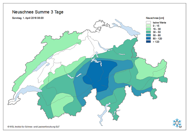 - In der Nacht auf den 31. März schneite es gebietsweise sehr intensiv. Eine Gegenstromlage liess die feuchte Luft aus Süden auch nördlich des Alpenhauptkammes weiter ansteigen. Bis am Morgen des 1. Aprils fiel in hohen Lagen im nördlichen Tessin sowie am zentralen Alpennordhang und den angrenzenden Gebieten etwa 1 m Neuschnee.