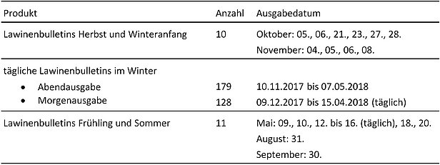 Das Lawinenbulletin erscheint seit dem 5. November 2017 und noch bis auf Weiteres täglich um 17 Uhr. Vom 9. Dezember bis am 15. April wurde jeweils zusätzlich um 8 Uhr ein Morgenbulletin herausgegeben. Das Lawinenbulletin enthält eine Prognose der Lawinengefahr und allgemeine Informationen zur Schneesituation. Es deckt die Schweizer Alpen, Liechtenstein und seit dem Winter 2017/18 neu auch täglich den Jura ab. Abgerufen werden kann es über www.slf.ch und die SLF-App „White Risk“.