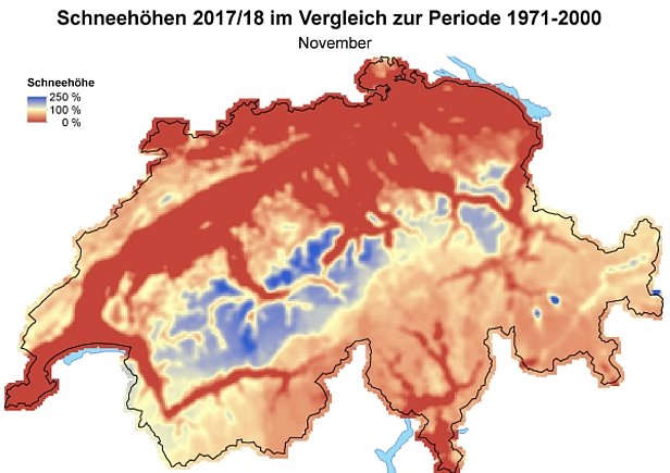 Ab dem 6. November lag in mittleren und hohen Lagen in allen Gebieten eine zusammenhängende Winterschneedecke. Bis Ende Monat war diese im Norden oberhalb der Waldgrenze auf einen Meter angewachsen. Über den ganzen Monat gesehen, waren die Schneehöhen im November in den Bergen des Alpennordhanges und des nördlichen Wallis überdurchschnittlich (blaue Farben in Abbildung 9/1), sonst verbreitet leicht unterdurchschnittlich. In tiefen Lagen lag viel weniger Schnee als üblich.