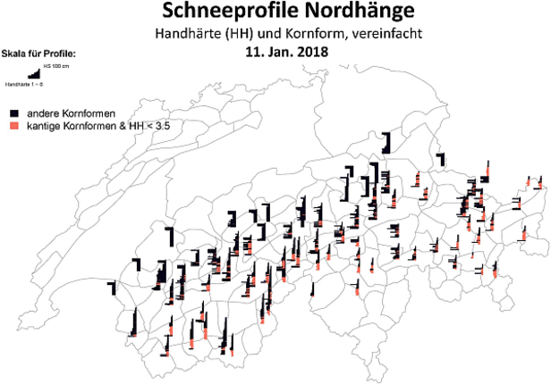 Vor der Niederschlagsperiode vom 16. bis 23. Januar war die Schneedecke am 15. Januar im Norden günstig aufgebaut. Weiche Schichten aus kantigen Körnern, wie sie für Schwachschichten typisch sind, waren kaum vorhanden (Abbildung 92). Im Wallis waren solche potenziellen Schwachschichten zwar vorhanden, aber bereits mächtig überlagert und damit nur noch schwer auslösbar. Im Süden und in weiten Teilen Graubündens war der Schneedeckenaufbau etwas weniger günstig. Die potenziellen Schwachschichten waren hier häufiger und zudem weniger stark überdeckt.