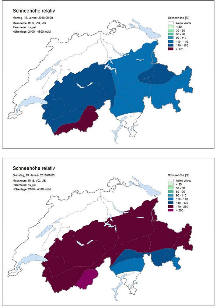 Der Januar 2018 war deutlich wärmer als der Februar 1999. Deshalb fiel der Niederschlag 2018 in tiefen und mittleren Lagen oft als Regen. Damit lag vor allem unterhalb von rund 1300 m deutlich weniger Schnee als im Februar 1999, und unterhalb von rund 2000 bis 2200 m wurde dieser gegen Ende der Niederschläge oberflächlich feucht. In hohen Lagen erreichten die Schneehöhen am 23. Januar 2018 im südlichen Wallis ähnlich hohe Werte wie im Februar 1999, sonst lagen sie darunter.