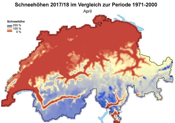 Der Februar war kälter und trockener als üblich. Auch der März war eher kühl, aber trüb, und der Süden und die Zentralschweiz erhielten nochmals bedeutende Schneemengen. Die Schneehöhen waren darum auch anfangs April vielerorts immer noch 1.5- bis 2.5-mal so hoch wie üblich.