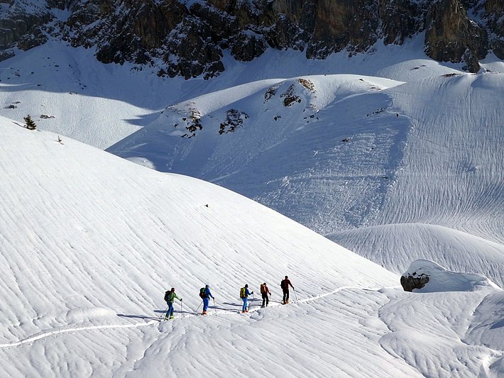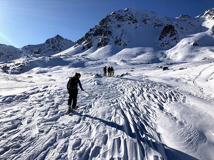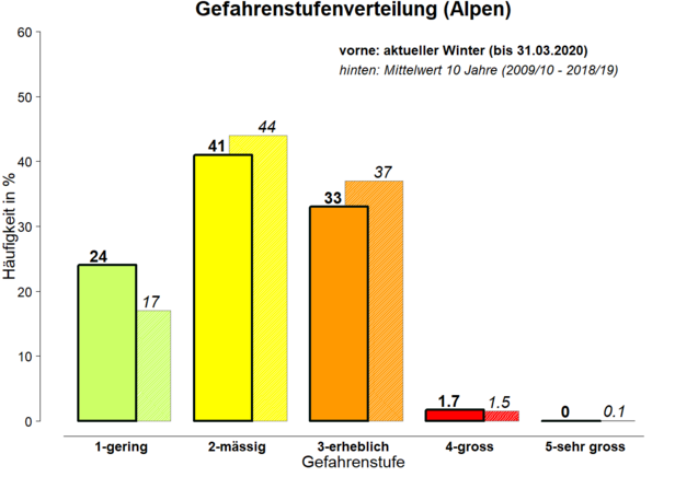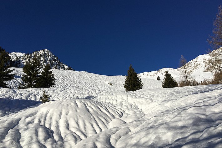Der Januar war geprägt von viel Sonne und milden Temperaturen. Im Mittel wurde weniger als 10 cm Neuschnee pro Messstation registriert (Auswertung von 130 Stationen von SLF und MeteoSchweiz, 29. Dezember 2019 bis 27. Januar 2020). Die Lawinengefahr nahm rasch ab auf Stufe 1 (gering) – eine seltene Lawinensituation für den Hochwinter. Da insbesondere in hohen Lagen genügend Schnee lag, herrschten dort optimale Bedingungen für Skitouren. In mittleren und tiefen Lagen blieb die Schneelage kritisch, dafür gefroren, wenn auch eher spät, die Seen in den Alpentälern und bildeten phantastisches Schwarzeis.