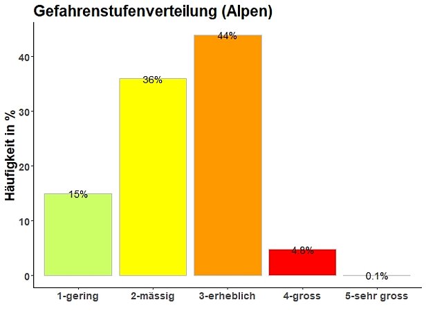 Bis Ende März war die Verteilung der Gefahrenstufen im Winter 2020/2021 wie folgt: Stufe 1 (gering) 15 %, Stufe 2 (mässig) 36 %, Stufe 3 (erheblich) 44 %, Stufe 4 (gross) 4.8 %, und Stufe 5 (sehr gross) 0.1 % (Abbildung 1). Perioden mit anhaltend und verbreitet grosser Lawinengefahr (Stufe 4) waren vom 14. bis am 16. Januar und vom 28. bis am 31. Januar, wobei in letzterer auch die Tage mit gebietsweise sehr grosser Lawinengefahr (Stufe 5) lagen. Am 15. und 16. März war die Lawinengefahr im Norden und Westen noch einmal verbreitet gross (Stufe 4).