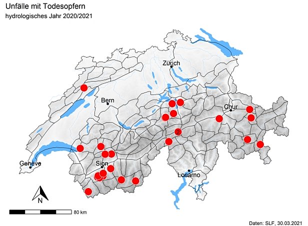 Insgesamt wurden dem SLF vom 1. Oktober 2020 bis am 30. März 2021 318 Schadenlawinen (Sach- und Personenschäden) gemeldet. Darunter waren 215 (Durchschnitt letzte 20 Jahre: 113) Personenlawinen mit insgesamt 296 erfassten Personen. Die Anzahl der erfassten Personen liegt mit rund zwei Dritteln deutlich über dem Durchschnitt der letzten 20 Jahre mit 177 erfassten Personen. Die Anzahl der Lawinen mit Sachschäden lag am 30. März bei 103 Lawinen und damit bereits leicht über dem Durchschnitt der letzten 20 Jahre per Ende September mit 86 Lawinen; die vollständige Erfassung der Sachschäden liegt erst per Ende September vor.