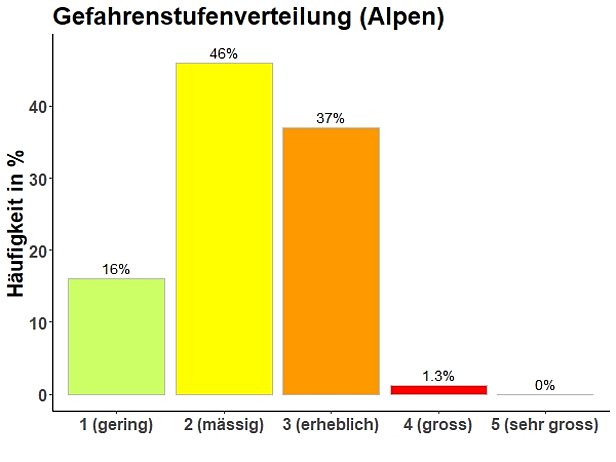Im Vergleich zum Durchschnitt der letzten 10 Jahre wurde bis Ende März die Gefahrenstufe 2 (mässig) etwas häufiger, die Gefahrenstufe 3 (erheblich) ähnlich häufig, die Gefahrenstufen 1 (gering) und 4 (gross) etwas weniger häufig prognostiziert. Die Gefahrenstufe 5 (sehr gross) kam nicht zur Anwendung.