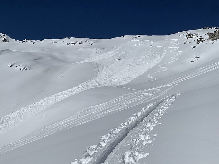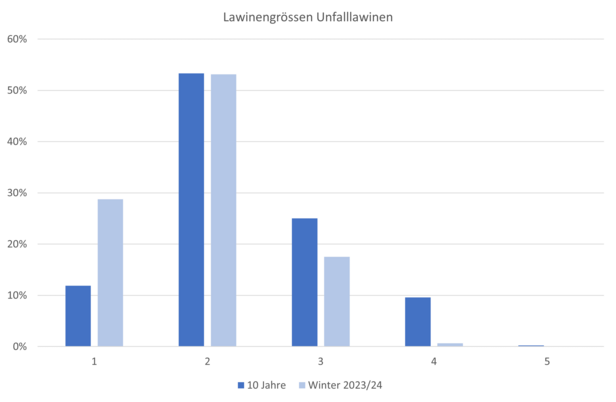 Erste Auswertungen zeigen, dass die Unfalllawinen im Winter 2023/24 kleiner waren als im Durchschnitt der letzten 10 Jahre. Dies kann damit erklärt werden, dass kaum Lawinen in bodennahen Schwachschichten ausgelöst wurden. Fast immer brachen die Lawinen in den frischen, oberflächennahen Schichten an. Nur im März gab es in den inneralpinen Gebieten auch Brüche etwas tiefer in der Schneedecke, allerdings war auch bei diesen Lawinen die Bruchausbreitung meistens nicht besonders ausgeprägt.