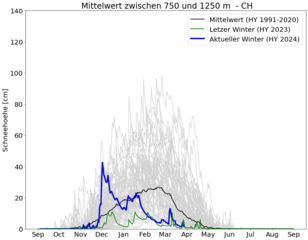 Der Winter 2023/24 war geprägt durch grosse Unterschiede in der Schneehöhe je nach Höhenlage. Die wärmsten Wintertemperaturen seit Messbeginn und stark überdurchschnittliche Niederschlagsmengen sorgten unterhalb von 1400 m mehrheitlich für unterdurchschnittliche Schneehöhen und gleichzeitig überdurchschnittliche Schneehöhen oberhalb 2000 m. So entspricht die mittlere Schneehöhe bis zum aktuellen Datum in den Flumserbergen (SG, 1310 m) rund 60 % und auf dem Weissfluhjoch (GR, 2540 m) rund 140 % des langjährigen Mittels.