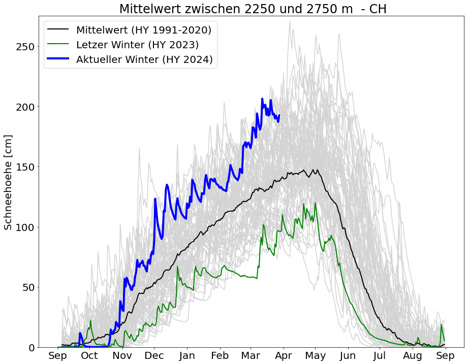 Oberhalb 2000 m waren die Schneehöhen seit Beginn fast immer überdurchschnittlich, wobei der Überschuss bis zu Beginn der südlichen Stauniederschläge Anfang März im Norden ausgeprägter war als im Süden. Die 45 automatischen Stationen in dieser Höhenzone, die seit mindestens 1999 in Betrieb sind, zeigen über den Zeitraum November bis März eine mittlere, relative Schneehöhe von 123 %, was Rang 5 in den letzten 25 Jahren entspricht.