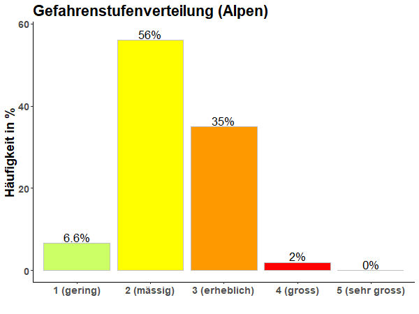 Im Vergleich zum Durchschnitt der letzten 10 Jahre wurde bis Ende März die Gefahrenstufen 1 (gering) weniger häufig, Gefahrenstufe 2 (mässig) häufiger, die Gefahrenstufe 3 (erheblich) und 4 (gross) ähnlich häufig prognostiziert. Die Gefahrenstufe 5 (sehr gross) kam nicht zur Anwendung. Der höhere Anteil der Gefahrenstufe 2 (mässig) dürfte auch damit zusammenhängen, dass fast über den ganzen Winter die Gefahr von Gleitschneelawinen mit dieser Stufe eingeschätzt wurde. In der hier dargestellten Verteilung wird im Falle von verschiedenen Lawinenproblemen, die gleichzeitig im Lawinenbulletin beschrieben wurden, die höchste Gefahrenstufe dargestellt.