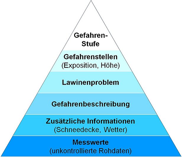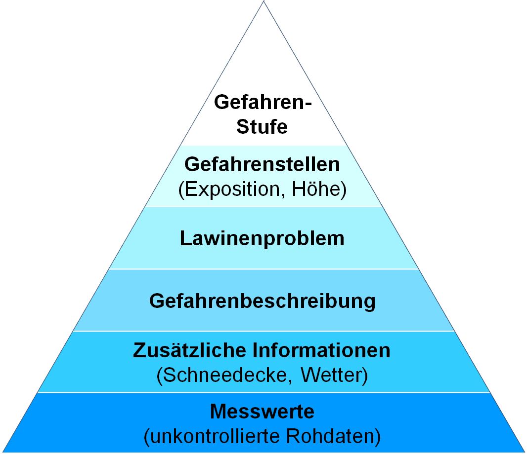 Das Lawinenbulletin ist in der Hauptsaison entsprechend der «Informationspyramide» strukturiert, d.h. das Wichtigste kommt zuerst (Gefahrenstufe), dann folgen Angaben über die Geländeteile, wo die Gefahrenstufe gilt, dann das Lawinenproblem, die Gefahrenbeschreibung sowie Informationen über die Schneedecke und das Wetter. Schliesslich können auch Messdaten abgefragt werden. Vereinheitlichte Begriffe vereinfachen das Verständnis und die Umsetzung.
