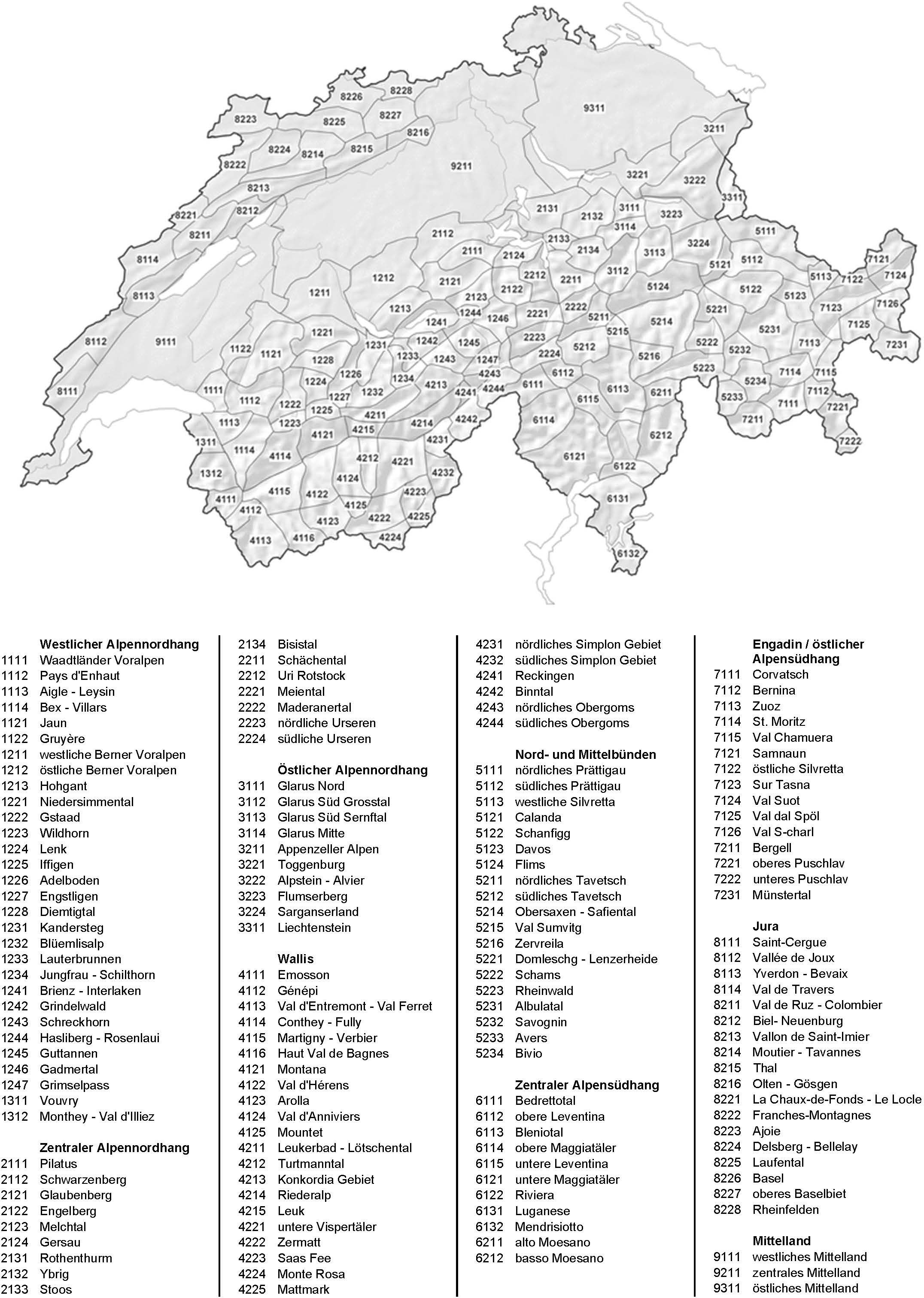 Basis für die Gebietseinteilung sind die Warnregionen, welche auch von den anderen Naturgefahrenfachstellen des Bundes (MeteoSchweiz, Bundesamt für Umwelt BAFU, Schweizerischer Erdbebendienst SED) verwendet werden. Eine Zusammenfassung von mehreren Warnregionen, meist aufgrund klimatologischer oder politischer Kriterien, ergibt übergeordnete Regionsbezeichnungen, siehe nachfolgende Karten.