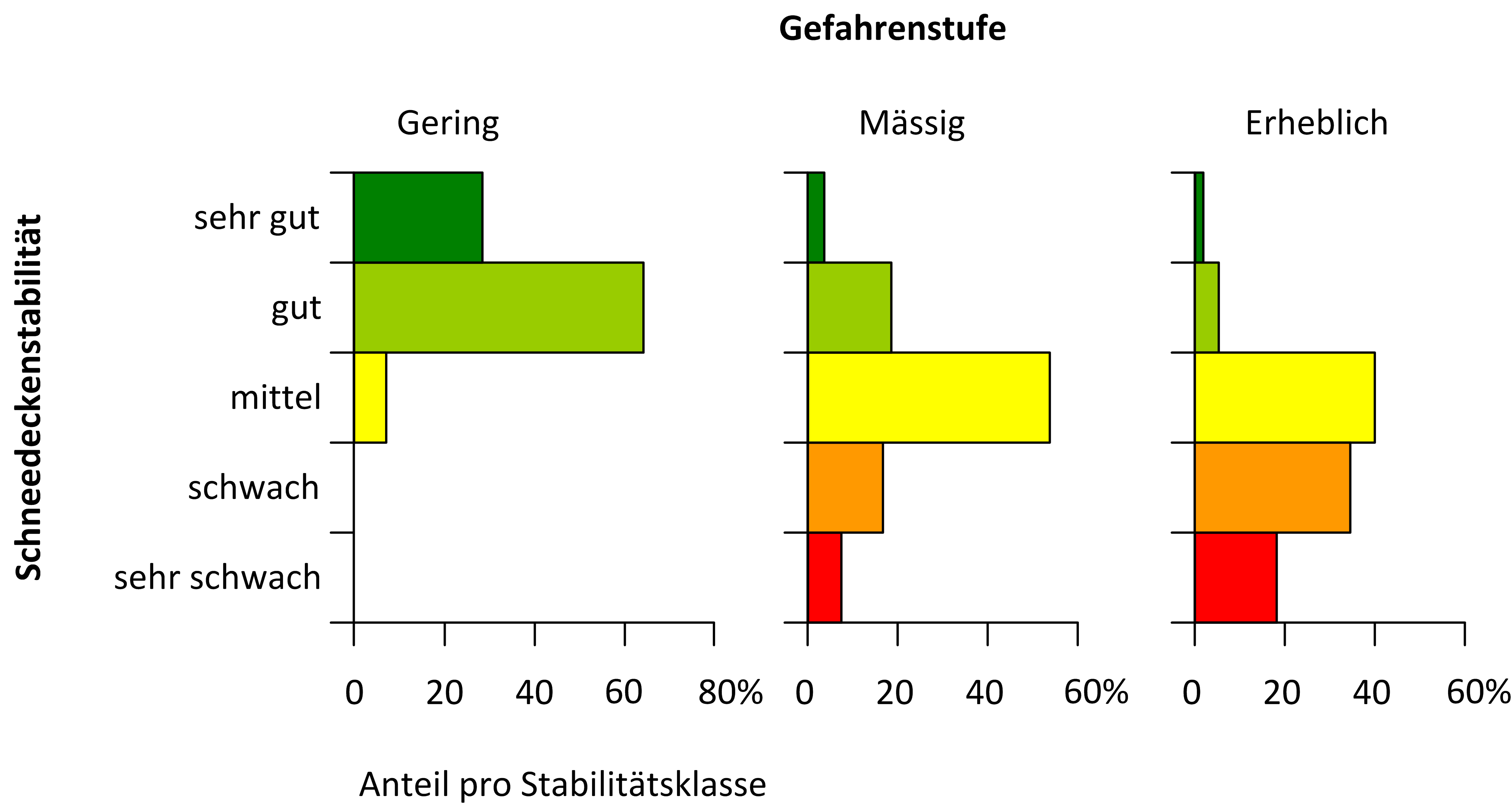 Nimmt die Schneedeckenstabilität ab und sind gleichzeitig mehr Orte vorhanden, wo Lawinen ausgelöst werden können, so steigt die Wahrscheinlichkeit einer Lawinenauslösung. Dies zeigt sich auch an der Stabilitätsverteilung in untenstehender Abbildung.