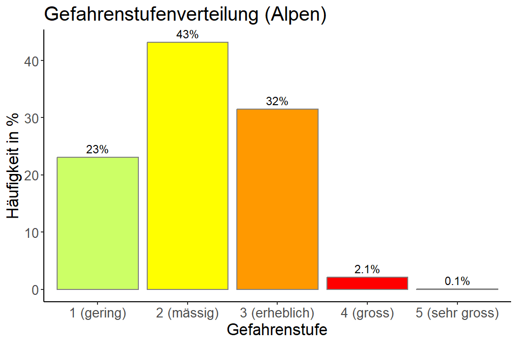 An zwei von fünf Tagen (pro Warnregion) wird in den Alpen die Gefahrenstufe 2 (mässig) prognostiziert. Sie ist die am häufigsten verwendete Gefahrenstufe und beschreibt Tage mit etwa „durchschnittlicher“ Lawinengefahr. Die Stufe 3 (erheblich) wird an etwa einem Drittel der Tage herausgegeben. Die Gefahrenstufe 4 (gross) wird im Schnitt nur an 2.1% der Wintertage herausgegeben, die Stufe 5 (sehr gross) nur äussert selten. Im Jura sind die tieferen Gefahrenstufen häufiger.