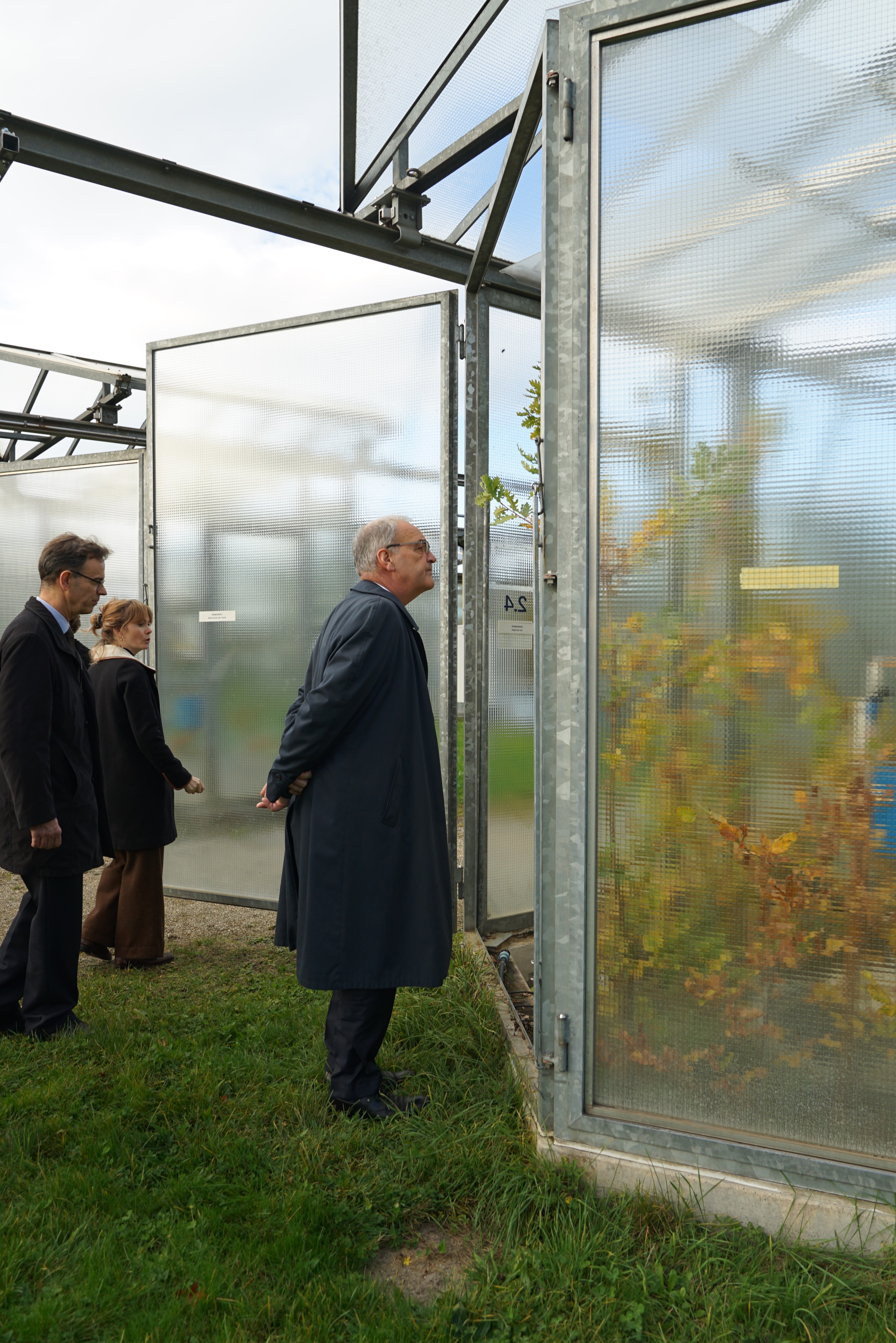 Von Charlotte Grossiord erfuhr Bundesrat Parmelin, wie die Forschenden in der Modellökosystem-Anlage die Auswirkungen von Hitze und Bodentrockenheit auf Waldbäume untersuchen. Diese Anlage besteht aus sechzehn Glaskammern mit Schiebedach, in denen die Temperatur- und Feuchtigkeitszufuhr experimentell verändert werden können.