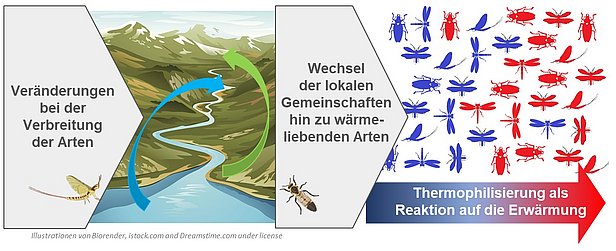 Wird es wärmer, sind viele Arten gezwungen, ihre angestammten Lebensräume zu verlassen und auf der Suche nach kühleren Klimazonen nach Norden oder in höhere Lagen zu ziehen. Lokal können so an Kälte angepasste Arten verloren gehen und durch Arten, die Wärme bevorzugen, ersetzt werden. Im Laufe der Zeit setzen sich wärmeliebende Arten immer mehr durch. Die Forschenden bezeichnen diese Verschiebung der Artenzusammensetzung als Thermophilisierung.