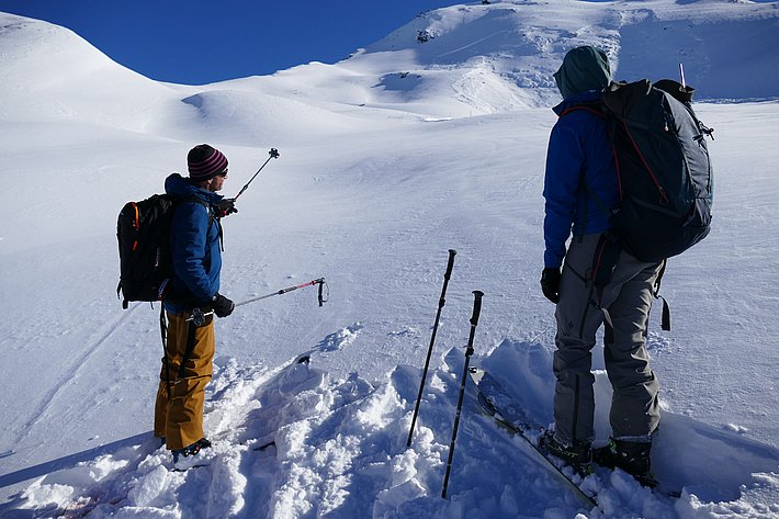 Am 7. Februar, unterhalb des Pischagrats bei Davos: Stephan Harvey, Experte für Lawinenbildung und Lawinenprävention am SLF, erklärt, wie er die richtige Stelle für ein Schneeprofil auswählt. (Foto: Jochen Bettzieche / SLF)