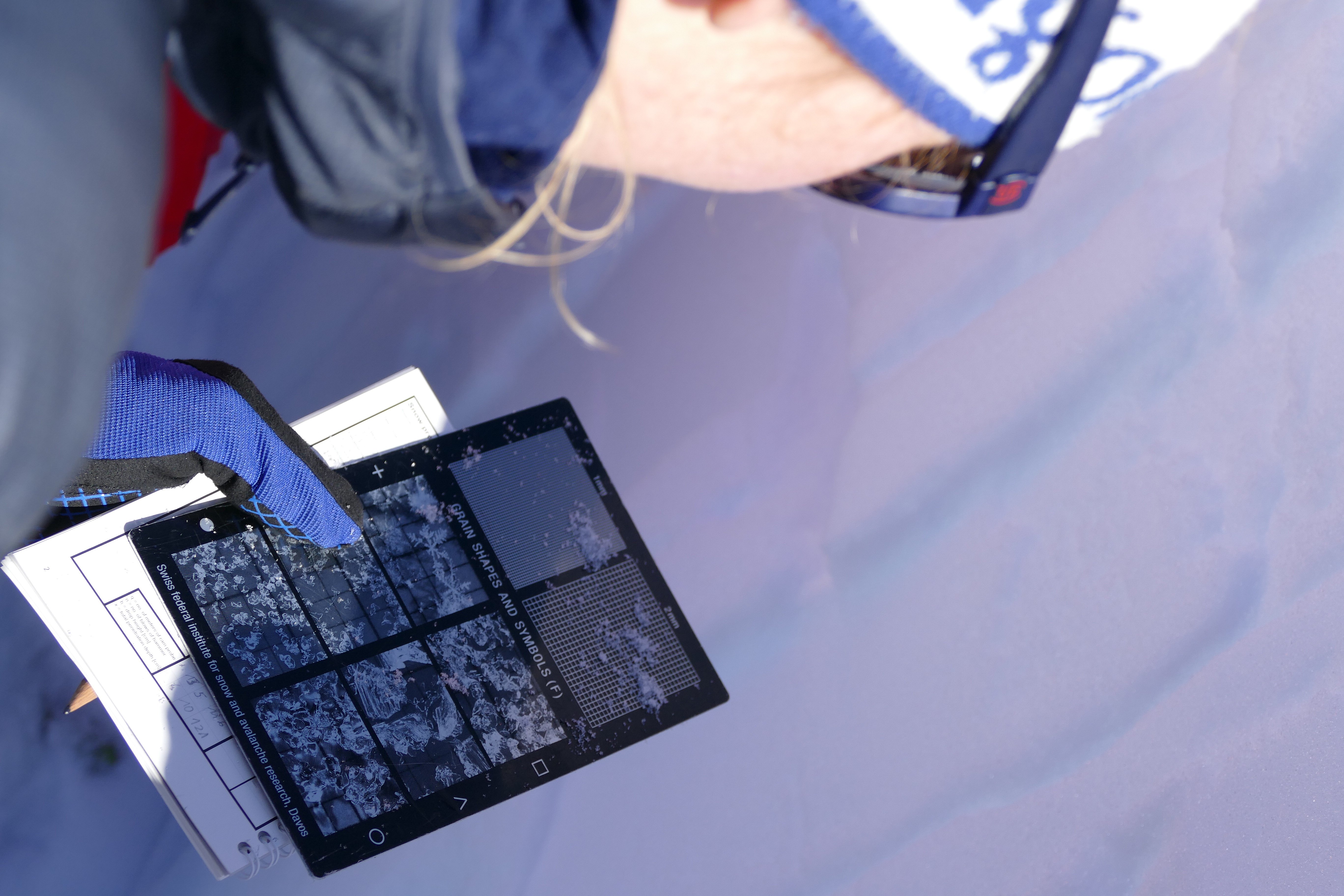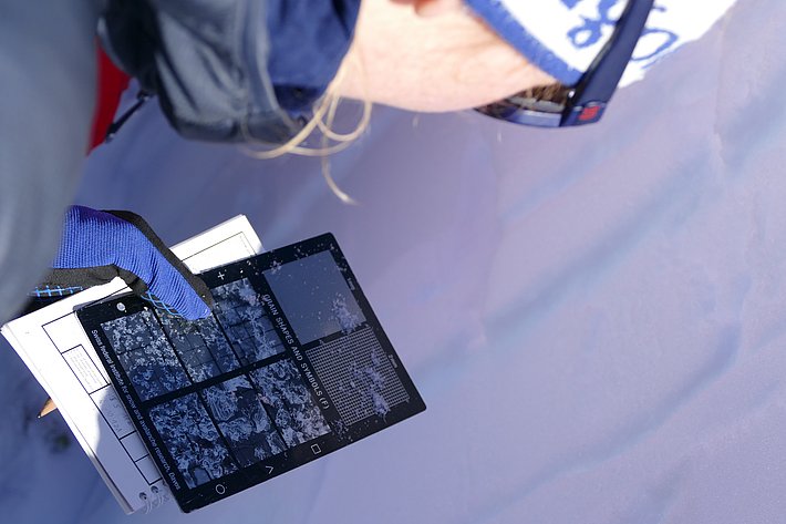 Dabei hilft auch die genaue Analyse der Schneekristalle mit Hilfe von Lupe und Raster. (Foto: Jochen Bettzieche / SLF)