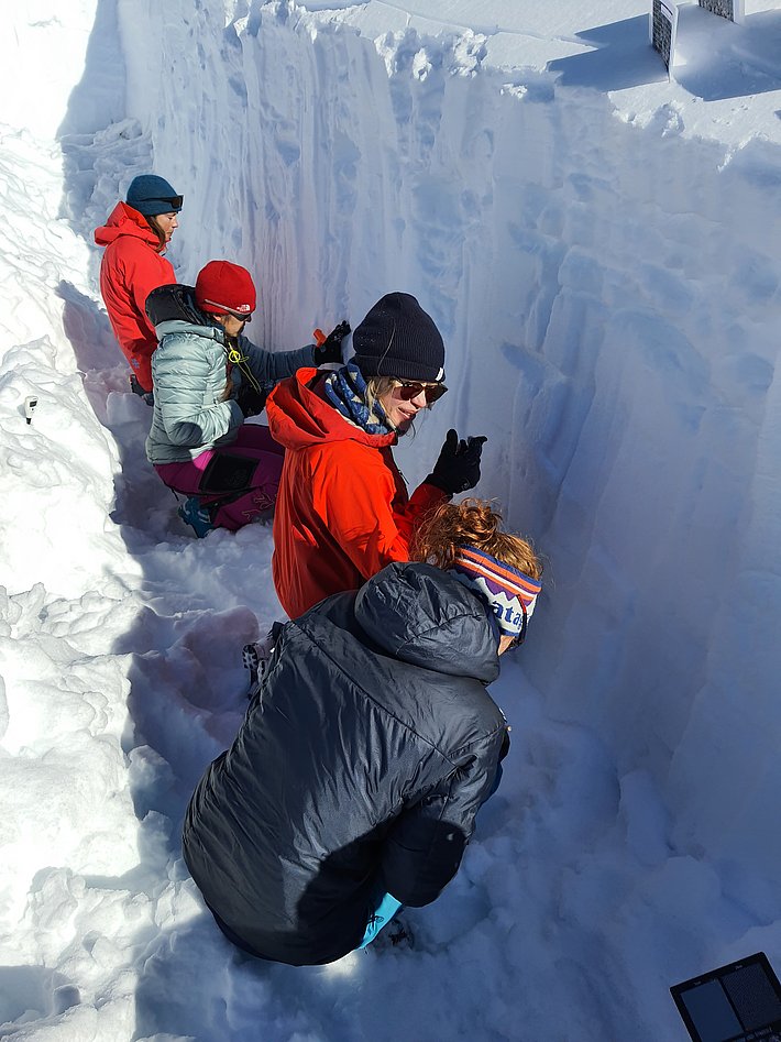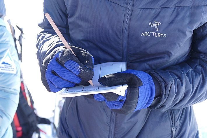 Die Teilnehmenden protokollieren die Schichten der Schneedecke. (Foto: Jochen Bettzieche / SLF)