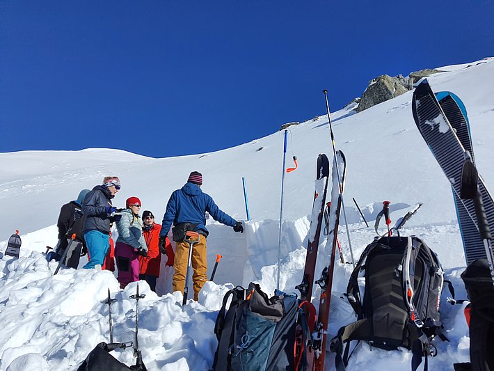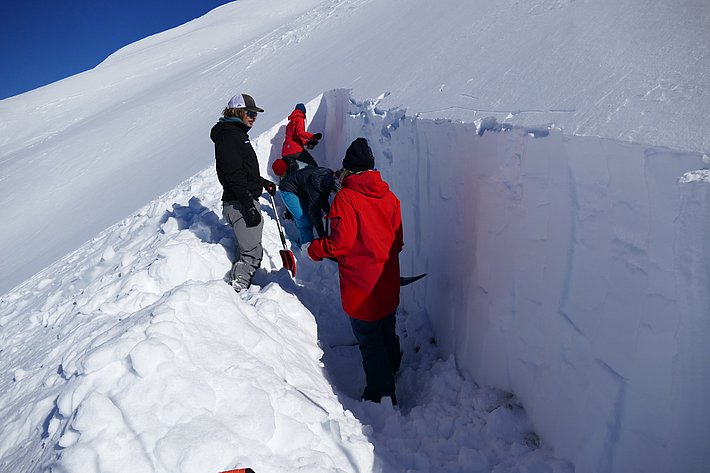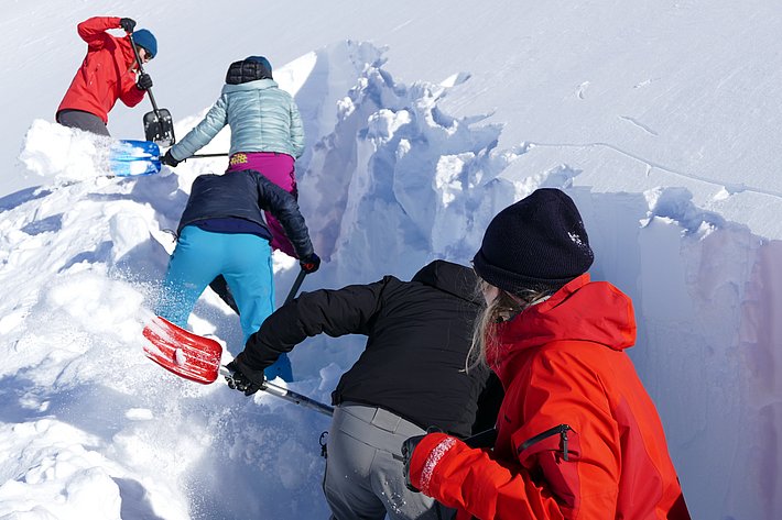 Gemeinsam schaufeln die Kursteilnehmerinnen und Kursteilnehmer eine Wand für das Schneeprofil … (Foto: Jochen Bettzieche / SLF)