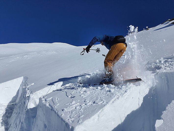 Der Höhepunkt kommt zum Schluss: Der Rutschblock. Harvey erhöht schrittweise die Belastung auf die Schneedecke und springt schliesslich darauf, so dass die Schwachschicht nachgibt. Im Ernstfall löst genau das eine Lawine aus. (Foto: Jochen Bettzieche / SLF)